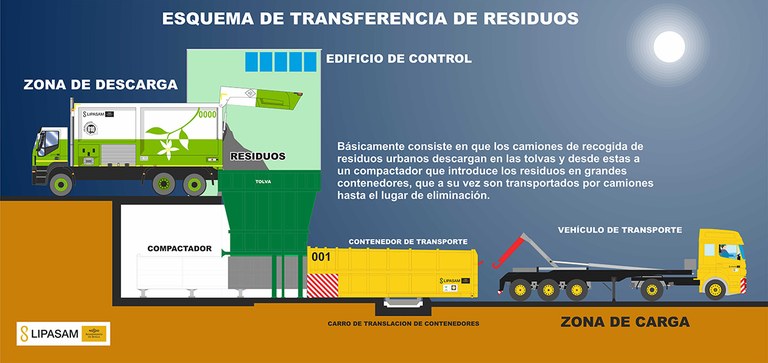 El funcionamiento de la Planta consiste básicamente en que los camiones de recogida descargan los residuos en unas tolvas, desde las cuales y mediante unos compactadores son introducidos en unos grandes contenedores que, una vez llenos, son transportados por camiones al Centro de Tratamiento.